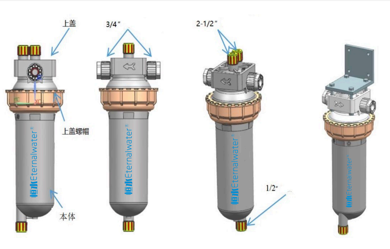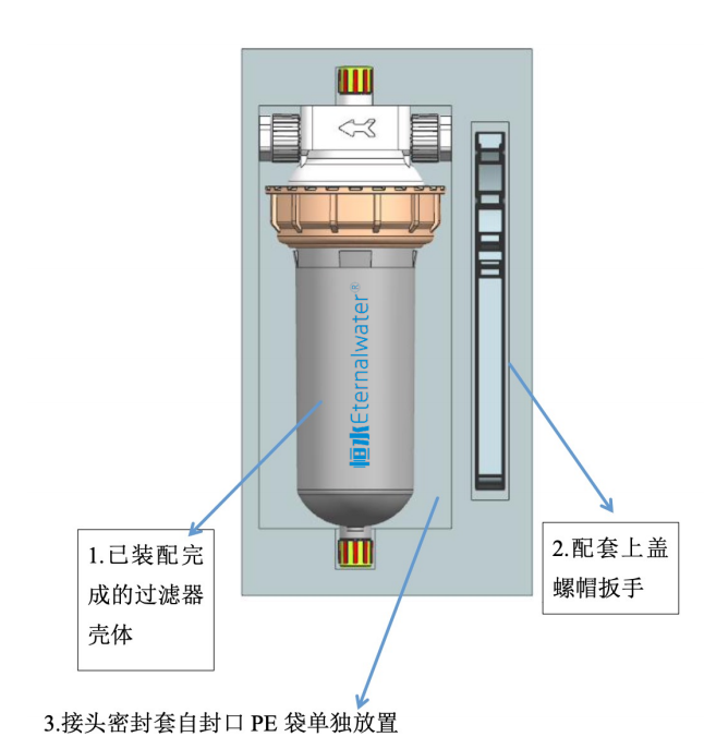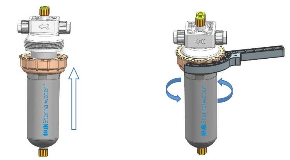 3.把過濾器本體裝入過濾器上蓋 4.使用配套扳手旋緊上蓋螺帽