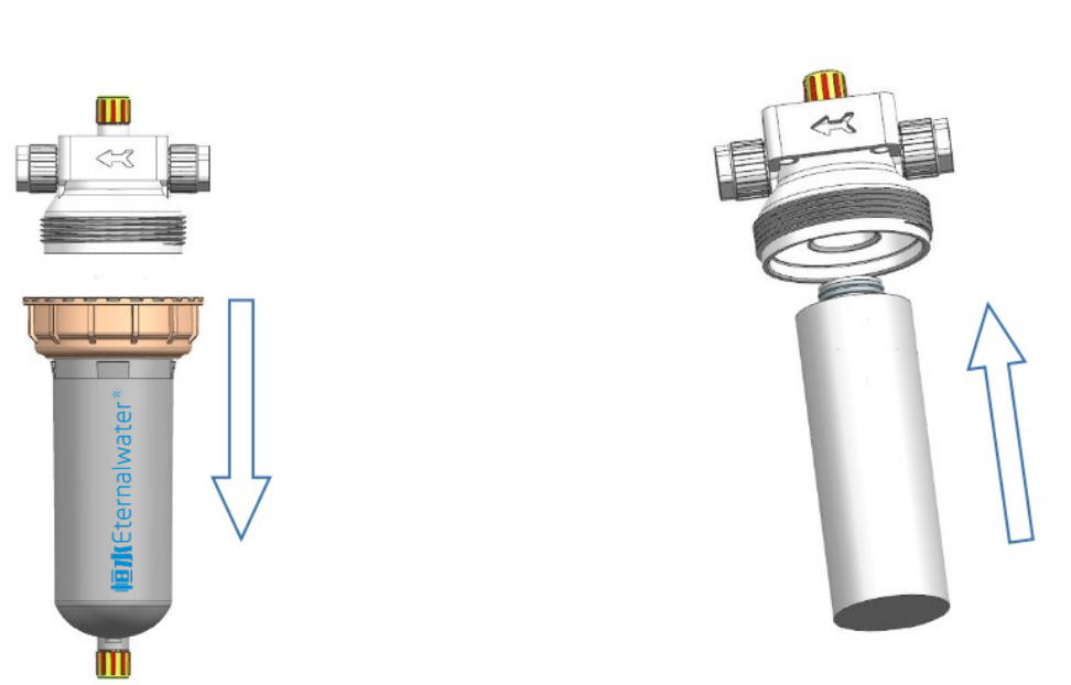 1.松開上蓋螺帽,取出過濾器本體 2.把濾芯裝入過濾器上蓋
